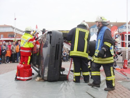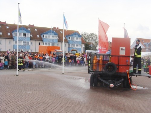 Götz Bormann erklärte, dass es ich um den Erlös aus dem Kalenderverkauf handelt. Der Kreisverband wird das Geld auf alle Jugendfeuerwehren des Kreises aufteilen. Nach der Übergabe trat dann die Landrätin Stefanie Ladwig in Aktion, als Taufpatin eines Busses. Der Bus trägt nun den Namen „Florian 7“ und ist der landesweit siebte Bus mit Werbung für den Dienst in der Jungendfeuerwehr. Mit Unterstützung der Firmen Makoben und Mundt wurde auch dieser Bus mit Feuerwehraufklebern versehen und so wurde die Öffentlichkeitsarbeit, die der Landesfeuerwehrverband ins Leben rief, wieder erweitert. Standesgemäß unter großen Beifall und der typischen Dusche aus der Kübelspritze ist die Taufe vollendet worden. Es waren mehr als 1.000 Besucher die sich die unterschiedlichen Vorführungen der Rettungskräfte ansahen. Es wurde nicht nur der Löschangriff vorgeführt auch die unterschiedlichen Bereiche der technischen Hilfe und ein Unfall mit gefährlichen Stoffen wurden sehr anschaulich dargestellt. Der Höhepunkt aber war sicherlich die Brandbekämpfung auf See. Der Seenotrettungskreuzer „Laboe“ nahm die Brandbekämpfung vor und die Besatzung eines Rettungshubschraubers rettete einen Schiffbrüchigen. Das Interesse der Besucher war so groß, dass der Pilot des Rettungshubschraubers eine Ehrenrunde und einen „Pilotengruß“ durchführte. Der Pilotengruß ist das „Winken“ mit den Rotorblättern durch seitliche Kippbewegungen. Die Zuschauer winken zurück, es gab viel Applaus. Mit unterschiedlichsten Spielen vergnügten sich die Mitglieder der Jugendfeuerwehren den ganzen Tag und knüpften dabei auch wehrübergreifende Kontakte. Der Kreiswehrführer betonte noch einmal ganz ausdrücklich, dass es alles in allem ein „geiler Tag“ war.
