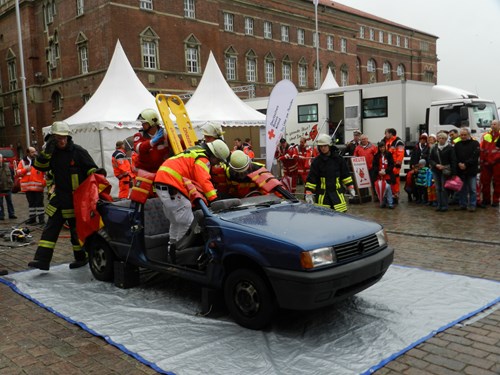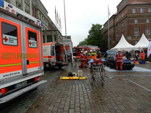 Wer sich zutraute konnte auch an diesen Tag im mobilen High-Tech-Blutspende-LKW Blutspenden. Auf der Aktionsfläche, vor dem Rathaus gab es dann verschiedene Vorführungen wie z.b. wie die der Rettungshundestaffel aus Schwarzenbek und Lemgo aus dem Kreis Bad Segeberg, Person von Leiter gestürzt, eine Fahrzeugschau vom Gerätewagen-Sanität ( GW-San) aus den Katastrophenschutz des Kreises Ostholsein Ortsverband DRK-Süsel und zum Schluss wurde ein Verkehrsunfall simuliert, in dem vier Verletzten davon eine Person eingeklemmt in PKW war, bei dieser Vorführung kam auch die Freiwillige Feuerwehr Kiel-Schilksee zur Unterstützung.