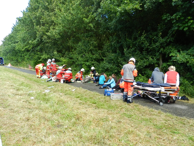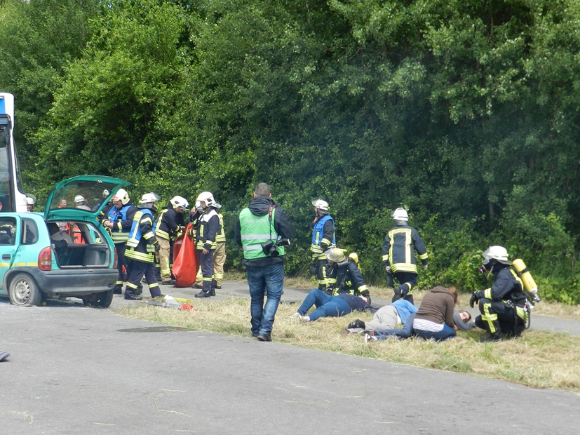 90 Verletzte schrien um Hilfe die unter Schock umherliefen und eingeklemmt waren. Ein Linienbus ist mit drei PKW's kollidiert. Einer der PKW's steckte in der Seitenscheibe des Busses fest. Mit Hilfe von Pyrotechnik brannte es und qualmte an verschiedenen Stellen.